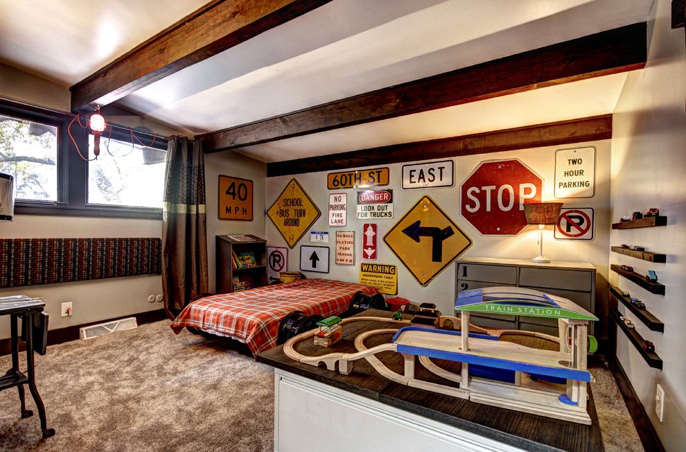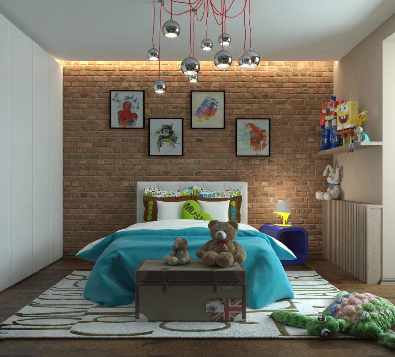 Персоналізувати дитячу кімнату для підлітка можна оформивши одну зі стін у вигляді цегляної кладки. Його друзі повинні оцінити таку недитячу обстановку.