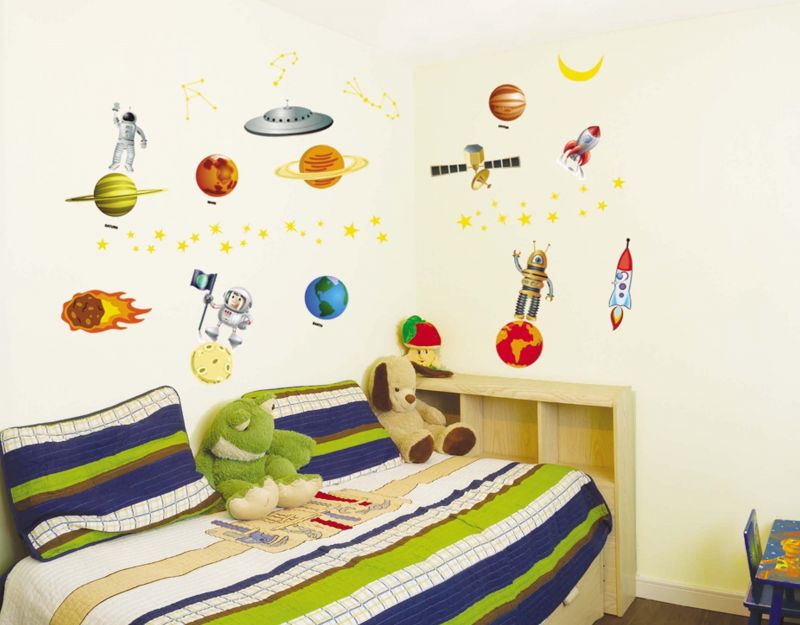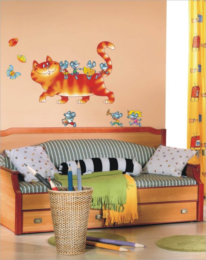 Однотонне простір здатні перетворити наклейки-стікери. Дитині буде цікаво і захоплююче самостійно вибирати їх, а тим більше брати участь в наклеюванні. При такому спільному преображення кімнати, для дитини вона стане рідніше і ближче – адже це ж він оформляв свій куточок.