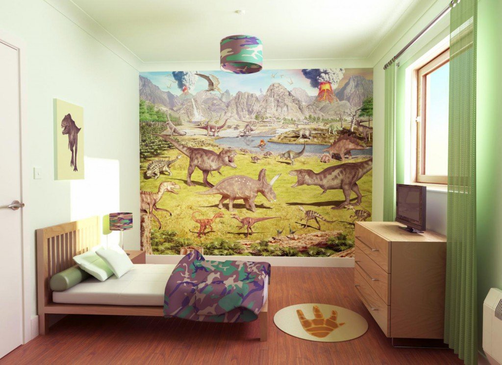 Дивовижний світ в кімнаті відтворять шпалери з фотодруком. Тематика може бути різна – легенди, казки, історії, тварини, улюблені герої дитини. Це буде оригінальне рішення про виділення акцентной стіни.