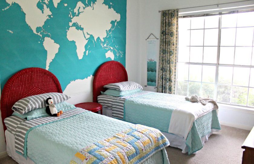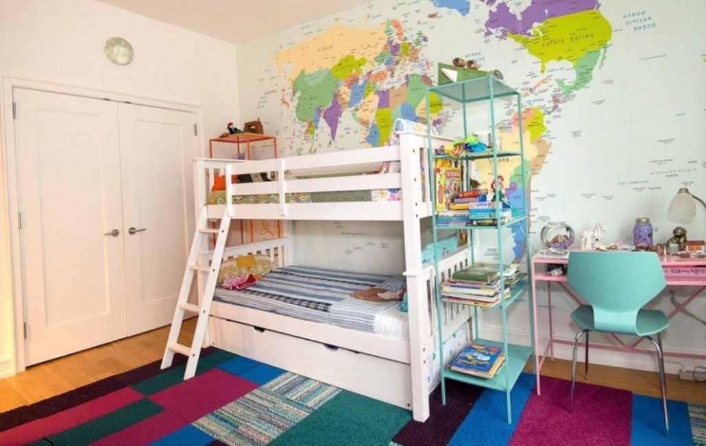 Зображення материка, карта світу або ж країни – також цікавий варіант акцентной стіни. Можна зобразити карту придуманого світу або неіснуючого королівства, якщо у дитини бурхливо розвинені фантазія і уява.