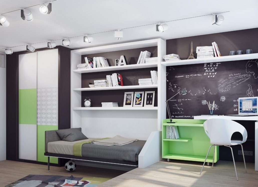 Якщо кімната підлітка невеликого розміру, то слід вертикальні поверхні обробляти у світлі тони, а акцентну стіну виконати в насиченому кольорі з використанням орнаменту, розпису або малюнка.