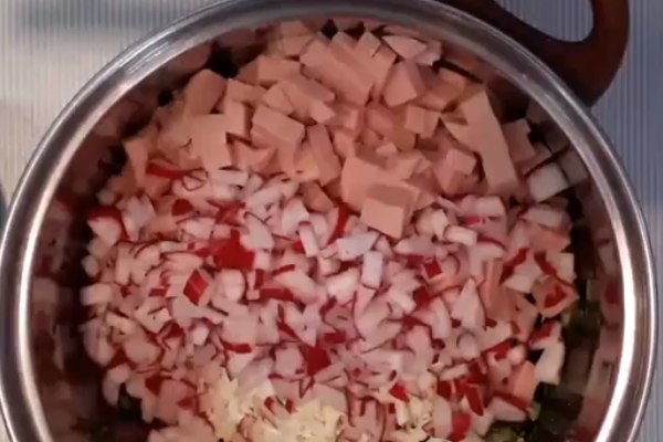 4. Редис, ковбасу і огірок шаткуємо невеликими кубиками. Відправляємо їх до зелені.