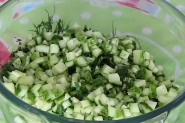 4. Огірки зазвичай чистять від шкірки. Але я цього робити не люблю. Кришимо їх маленькими кубиками і скидаємо в ємність.