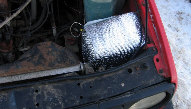 - Утеплення з використанням додаткових матеріалів. Хорошим рішенням при утепленні акумуляторної батареї автомобіля є встановлення джерела живлення в контейнер з подвійними стінками. Між стінками міститься матеріал, який ускладнює охолодження акумуляторної батареї. Найчастіше в якості такого матеріалу виступає пінопласт, повсть або силіконові блоки;