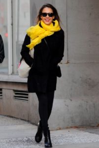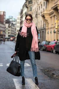 Якщо температура на вулиці, підійде легкий атласний або шифоновий шарфик чи хустка ніжних пастельних відтінків. Такий аксесуар додасть образу романтики і жіночності, особливо на контрасті з об’ємною сумкою або масивної взуттям.