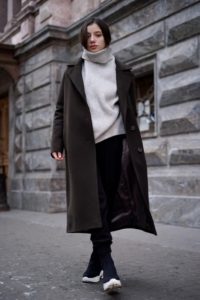 Як і раніше, залишається стильним поєднання пальто з масивними спортивними кросівками або кедами. Причому таке взуття може доповнити як образ з пальто оверсайз, так і урізноманітнити модель класичного крою.