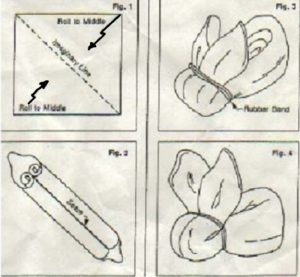 Потрібно взяти квадратну серветку і закрутити її з двох кутів до центру в трубочку. Зав’язати гумкою в середині так, щоб кінчики утворили вушка.