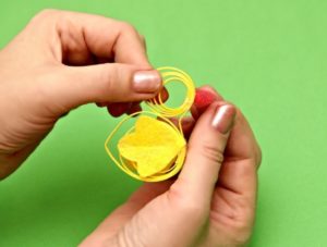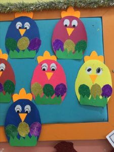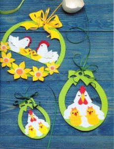 З кольорового паперу або з щільної тканини потрібно вирізати курчатам крила та дзьоби, а курці – гребінець, так само зафіксувати клеєм.