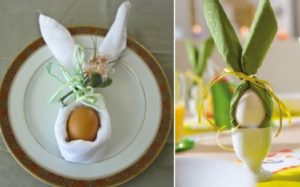 Таку швидку виріб можна робити як з паперової серветки, так і з бавовняної. Знадобляться: серветка, яйце і стрічка для завязування. Квадратну скласти серветку трикутником і закрутити валиком. Обернути яйце і розправити вушка. На яйці можна домалювати милі мордочки простим маркером.
