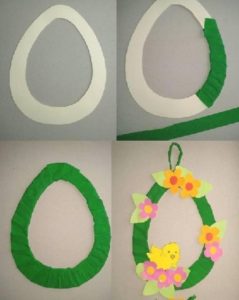 З картону вирізати круглий або овальний обідок. Він буде служити основою всієї композиції. Тепер потрібно прикрасити обідок. Можна обмотати його стрічками або просто пофарбувати фарбами в будь-який колір. Далі готують яйця. Можна заклеїти їх вакуумними наклейками, прикрасити стрічками, або гарно розписати фарбами, залежно від наявності вільного часу і терпіння. Коли основа яйця підготовлені, можна приступати до створення композиції. Для цього буде потрібно клей, краще використовувати гарячий клей з пістолета. Крім яєць, можна приклеїти штучні квіти або гілочки живої верби. Можна заклеїти всю основу, а можна тільки нижній півколо. Важливо також зробити петельку, що б було на що, почепити вінок.