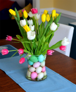 Ще одним видом прекрасною великодньої композиції з живих квітів є ваза. Тут все дуже легко і просто. Потрібно взяти прозору скляну вазу, (якщо такий не є, можна використовувати 2-3-літрову банку), на дно покласти варені фарбовані яйця. Обов’язково перевірити цілісність яєць, щоб не було, нарубав і тріщин. На дві третини вази укласти фарбовані яйця, заповнити водою бутель по плічка, а зверху вставити будь-які живі квіти.