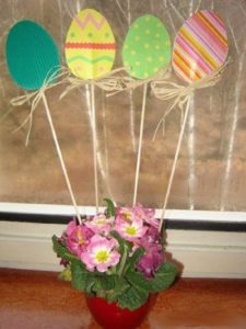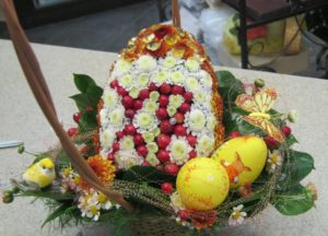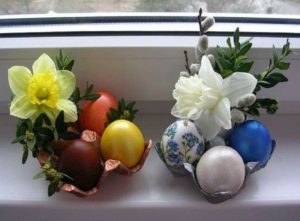 Така композиція може бути двох видів – жива і штучна. Для живої композиції, можна використовувати варені яйця і живі квіти, а для штучної – декоративні яйця та штучні квіточки.