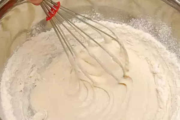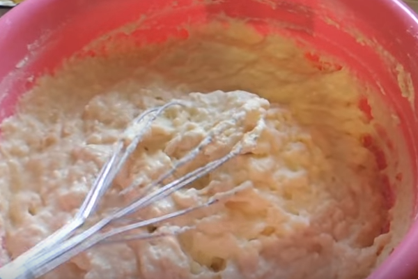 4. Борошно просіваємо і частинами вмішуємо в тісто. Воно повинне вийти трохи густіше, ніж для оладок.