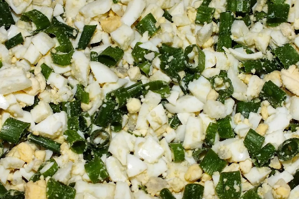6. Яйця відварюємо і охолоджуємо в холодній воді. Чистимо і ріжемо за допомогою яйці різання або ножем кубиками. Змішуємо їх з цибулею.