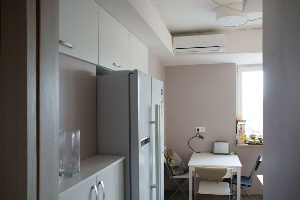 В рамках приміщення з маленькою площею складно говорити про розміщення обідньої зони, але інтегрувати побутову техніку в невеликий простір вийде успішно. Строгість форм і ліній, мінімальний декор, дзеркальні і скляні елементи, світлі тони оздоблення – прийоми, які візуально збільшують будь-який простір.