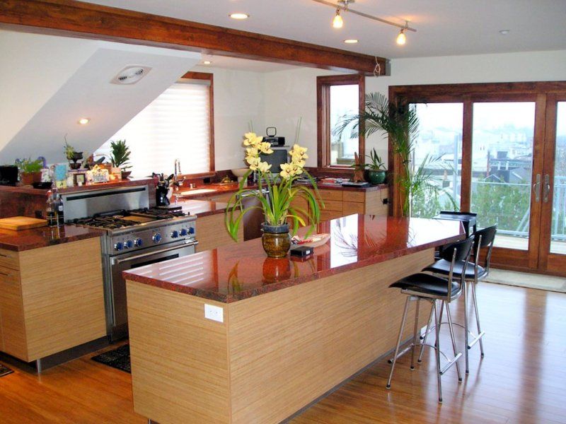 Острів можна забезпечити варильною панеллю, раковиною, винним холодильником, посудомийною машиною. Переваги даного типу планування – висока функціональність, створення ефективного і єдиного простору. Але, на жаль, для маленьких приміщень острівне планування не підійде.