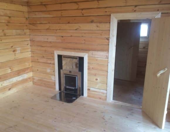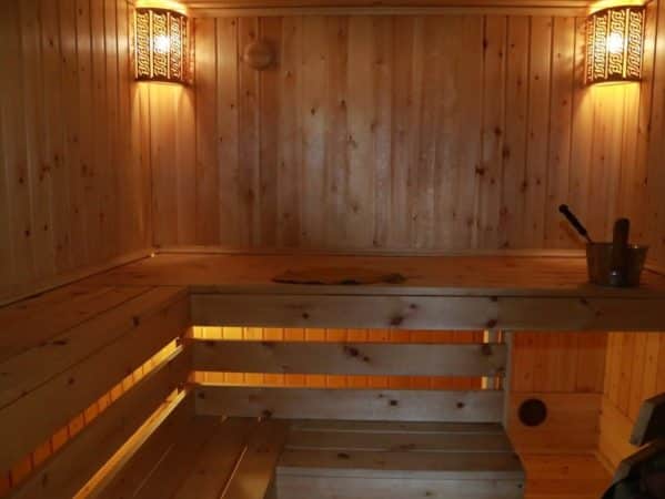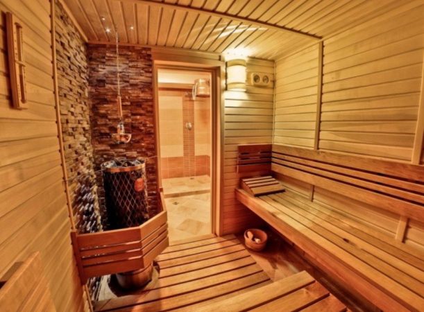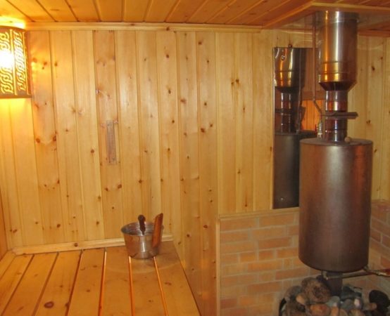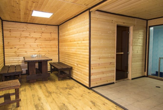 Внутрішні стіни обшивають дерев’яною вагонкою. Найчастіше використовують породу дерева – сосна, рідше модрину. Поверх деревини наносять спеціальний склад, який захищає від розбухання. Для освітлення використовують термостійкі світильники.