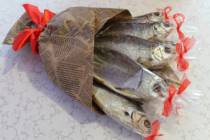 - Букет з улюблених рибних сортів – такий презент стане відмінним варіантом привітання батька-рибалку. Дізнавшись заздалегідь, яку сушену рибку він віддає перевагу, можна придбати її в магазині, там же відшукати пакувальний папір коричневого кольору і красиву стрічку. Спорудити букет буде нескладно.