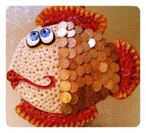 - «Грошова» рибка – юному майстрові знадобиться солоне тісто, з якого він в подальшому зробить монетки, і лак.