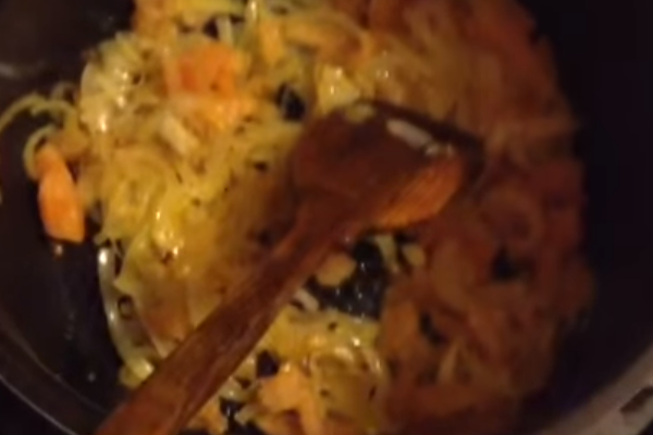 4. Цибулю чистимо і дрібно нарізаємо. Обсмажуємо до золотистого кольору. Відправляємо в каструлю разом з першою партією спецій: корінь петрушки, хмелі-сунелі, соус ткемалі і коріандр.