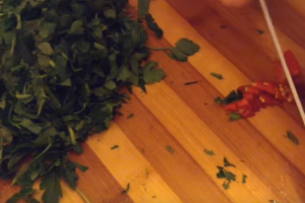 8. В цей час петрушку і кінзу промиваємо і сушимо паперовими рушниками. Дрібно шаткуємо разом з часником.