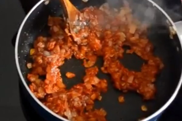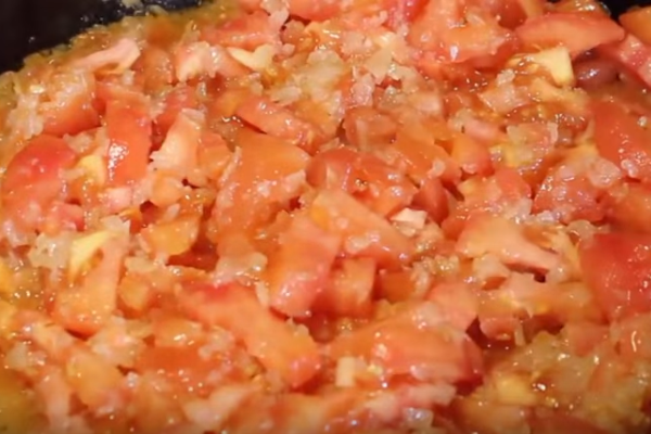 5. Помідори ошпарюємо окропом і чистимо шкірку. Нарізаємо їх дуже дрібно і обсмажуємо на сковороді. Також додаємо томатну пасту.