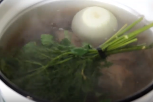 1. Курку миємо й ріжемо на 4 частини. Скидаємо в киплячу воду. Туди ж відправляємо очищені цілі моркву і цибулю. А також, пов’язані в один пучок, зелень. Варимо на середньому вогні 1,5 години.