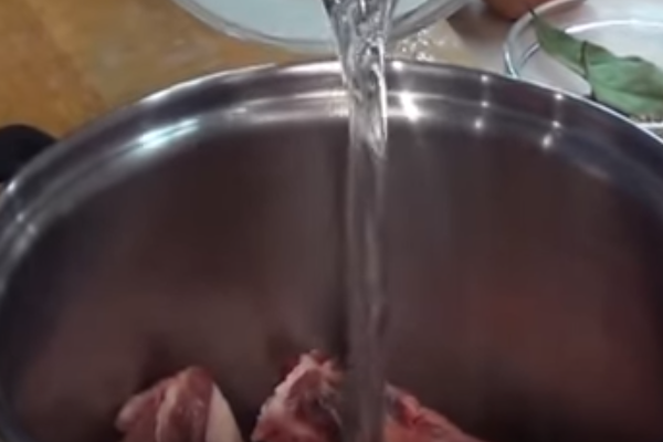 1. М’ясо миємо і кладемо в каструлю. Заливаємо водою і ставимо на плиту. Варимо 1 годину, постійно прибираючи утворену піну.