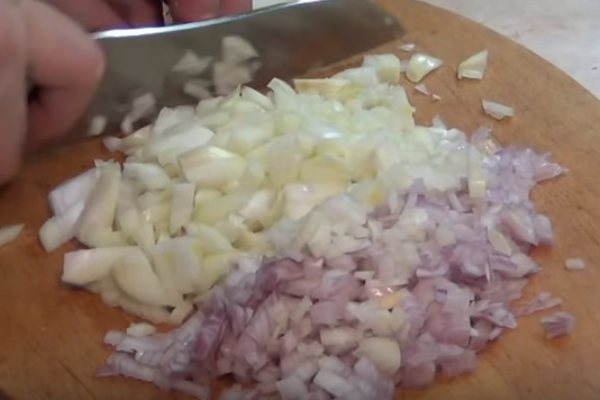 4. Тепер займемося засмажкою. Цибулю чистимо і дрібно шаткуємо. Обсмажуємо її на рослинній олії до золотистого кольору.
