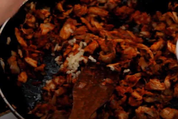 5. Додаємо до нього подрібнену курку. Потім томатну пасту і пропущений через прес часник. Видавлюємо сік з лимона. Все заважаємо.