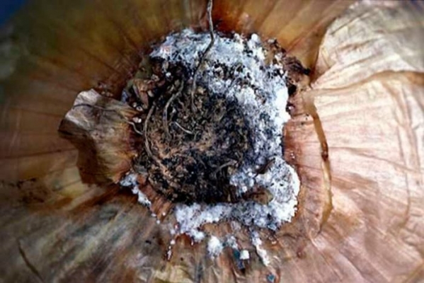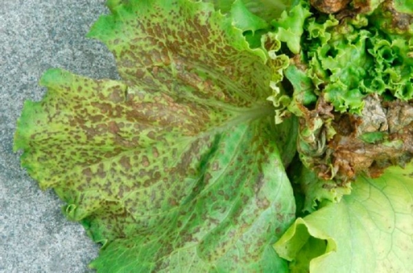 Несправжня борошниста роса (пероноспороз) сприяє тому, що на лицьовій поверхні листків утворюються хлоротичні плями, по мірі розвитку хвороби вони жовтіють і стають олійними, а потім буріють. Пізніше на нижній поверхні пластин під точками утворюється наліт брудно-фіолетового забарвлення.