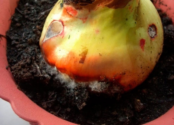У редьки ураженої червоної гнилизною, або повстяною хворобою на поверхні коренеплодів з’являються цятки лілового і бурого кольору, після чого на цих місцях формуються склероції грибка темного кольору.