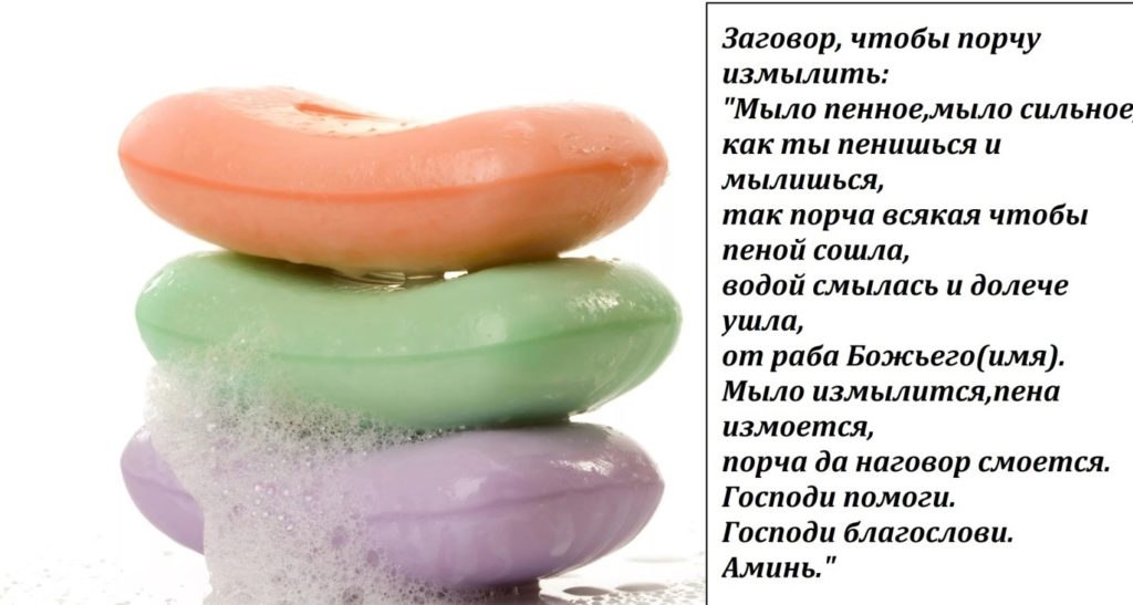 Щоб зняти порчу в домашніх умовах, можна прочитати змову на новий шматок мила. Ритуал з милом дуже ефективний у тих випадках, коли наведена порча на відібрання краси і здоров’я. Для обряду знадобиться новий шматок звичайного мила – мило ручної роботи не підійде. Читати слова змови слід 7 разів. Після кожного прочитання мило хрестити один раз.