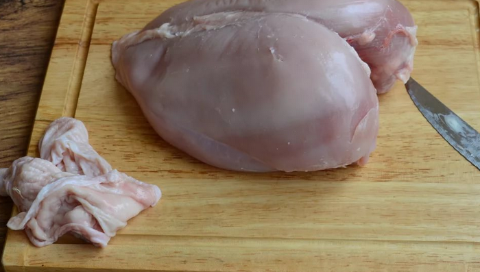 1. Візьмемо курячу грудку приберемо з неї шкірку, вимиємо і даємо м’яса висохнути.
