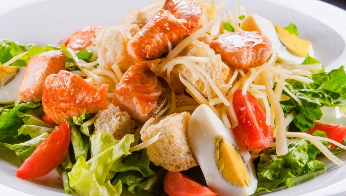 Раз вже ми почали експериментувати з салатом цезар, різними інгредієнтами, давайте зробимо його з сьомгою. Мені він дуже сподобався, я хочу щоб ви теж спробували і пригостили своїх гостей, родичів. Адже сьомга надає ніжний і приємний смак, який доведеться всім до душі.