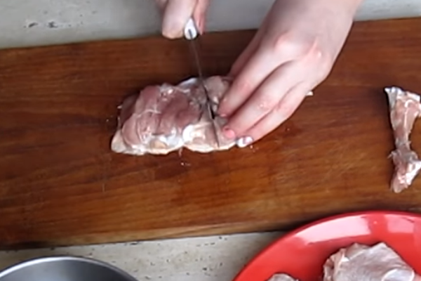 1. Грудку миємо й розрізаємо на 3 частини, але ви можете порізати хоч на скільки. Головне, щоб їх можна було одягнути на шампури. Складаємо в глибоку ємність.