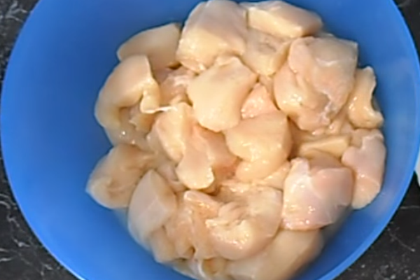 1. Можете взяти курячу грудку, але я взяв стегна. Прибираю кістки, а шкіру залишаю. Кожне розрізаю на 3 частини і складаю в миску.