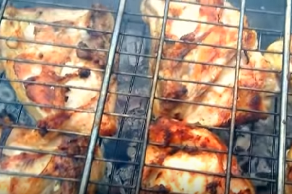 6. Курку складаємо на решітку без цибулі, так як він швидко згорить і додасть шашлику гіркоти.