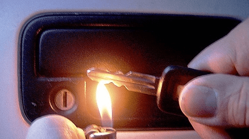 - Нагріти звичайної запальничкою ключ і вставити його всередину замку запалювання, після чого через хвилину спробувати провернути. Якщо не допоможе, нагріти ключ знову і повторити процедуру. Згодом лід під дією тепла, що виходить від ключа, розтопиться, і рухомі деталі механізму провернуться.