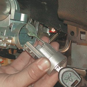 Другий спосіб вкрай непростою. Водієві потрібно зняти пластмасовий корпус з рульової колонки і дістатися до язичка, після чого зрізати його або висвердлити. Ситуація ускладнюється тим, що в кожному автомобілі процес демонтажу деталей буде відрізнятися, відповідно, єдиного алгоритму дій назвати не можна. Крім того, великий ризик пошкодження рульової колонки при роботі з дрилем або ріжучими інструментами. Зрізавши язичок, потрібно видалити замок і замінити його на новий.