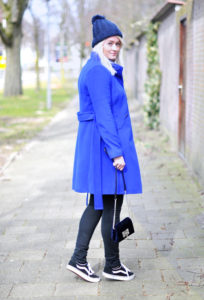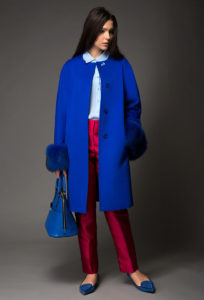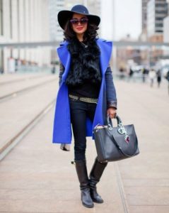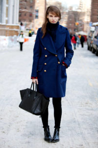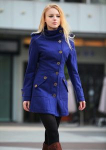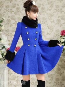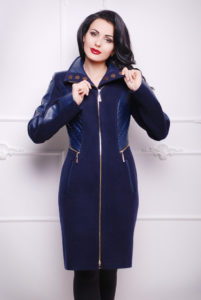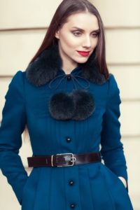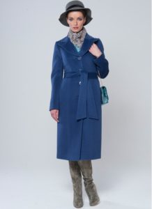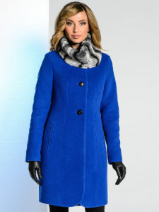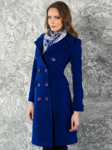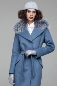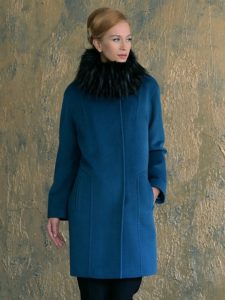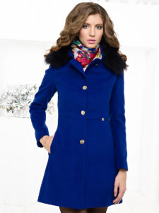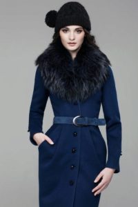 У холодну пору відмінно зігріває тепле синє пальто з щільної вовни з розкішним хутряним коміром. Додасть образу витонченості широкий шкіряний ремінь на талії, також дизайнери прикрашають хутром рукава, кишені і капюшони, при цьому особливо ефектно виглядає узлісся наближену по тону або, навпаки, контрастного кольору.