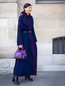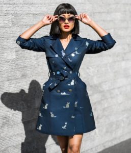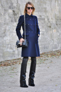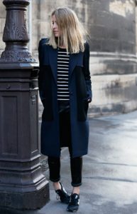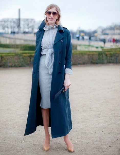 Класичний двобортний тренч темно-синього кольору довжиною до коліна слід носити зі стриманим сукню-футляр, спідницею-олівець і прямими брюками зі стрілками. Ідеальним доповненням до такого луку стануть елегантні туфлі-човники на високих підборах.