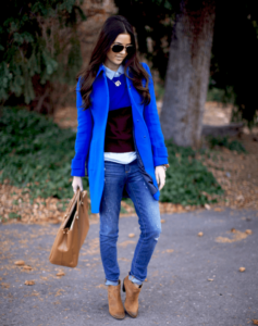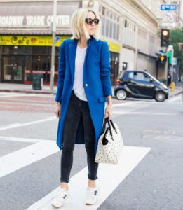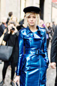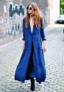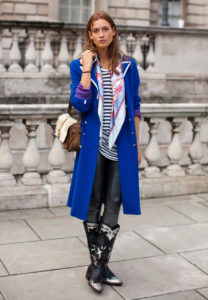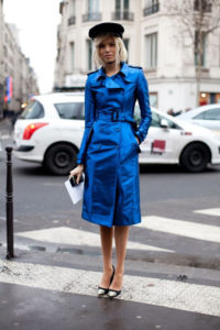 З модним васильковим, блакитним або кобальтовим тренчем можна носити і високі чоботи на товстій стійкому каблуці, і акуратні черевики на танкетці, і короткі чобітки на низькому ходу.