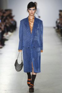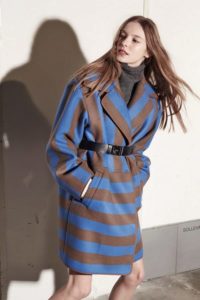 Дуже цікаво синій колір обігрується в традиційному картатому принті – дизайнери вміло комбінують відтінки електрик, кадмій і берлінську лазур з чорним, червоним, сірим або рожевим. Також на модних подіумах можна побачити затишні пальто-халати у блакитно-кавову смужку і екстравагантні синьо-фіолетові тренчи з великим візерунком гусяча лапка.