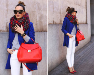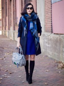 З верхнім одягом насиченого волошка синя, ультрамаринового, блакитного кольору індиго чудово виглядають шовкові хустки і великі палантини. Якщо говорити про колір хустки або палантину, який ідеально підійде до синьому пальто, то це небесно-блакитний, сизий, колір морської хвилі, світло – і темно-сірий, рожевий, фіолетовий, білий, чорний.