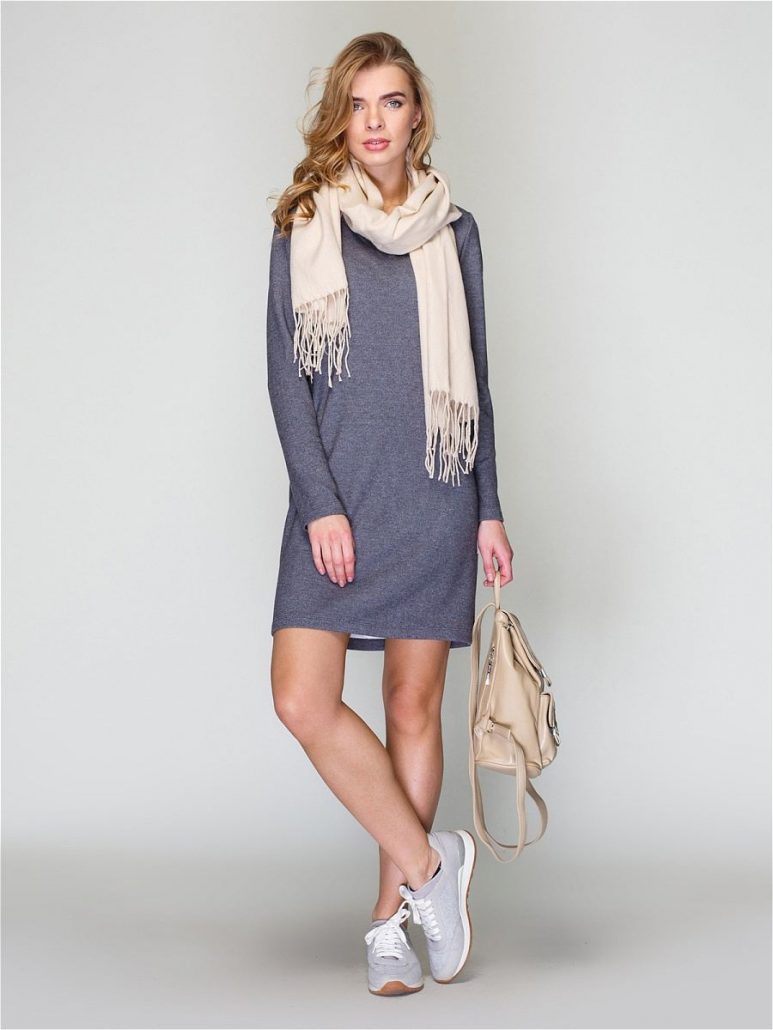 Сіра сукня буде виглядати більш цікаво, якщо його доповнити короткими чорними рукавичками і яскравим помаранчевим шарфом. Використання різноманітних аксесуарів тільки допоможе вам вдаліше продемонструвати оточуючим власну індивідуальність і тонкий смак.