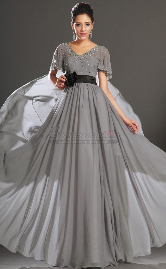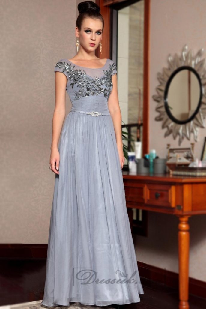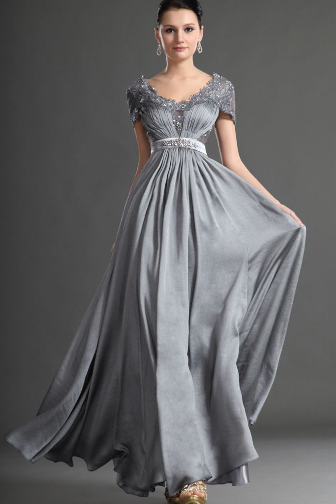 Просто розкішно буде виглядати сіре вечірнє плаття з мереживними ліфом і широкої шифоновою спідницею.