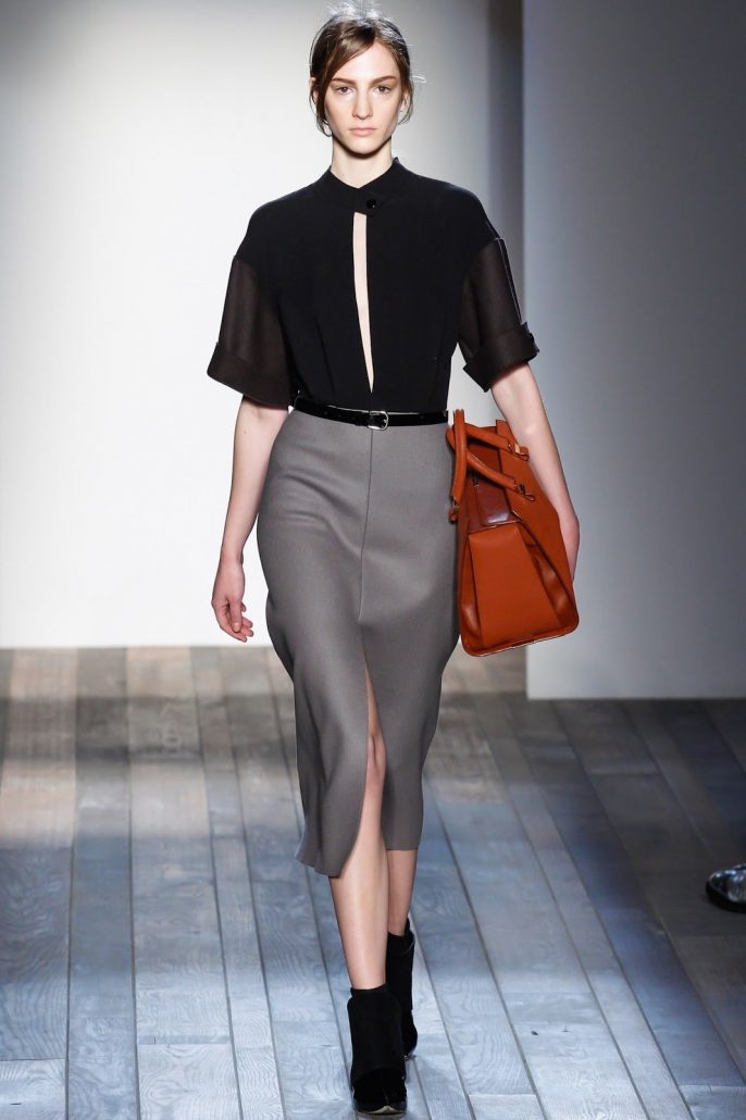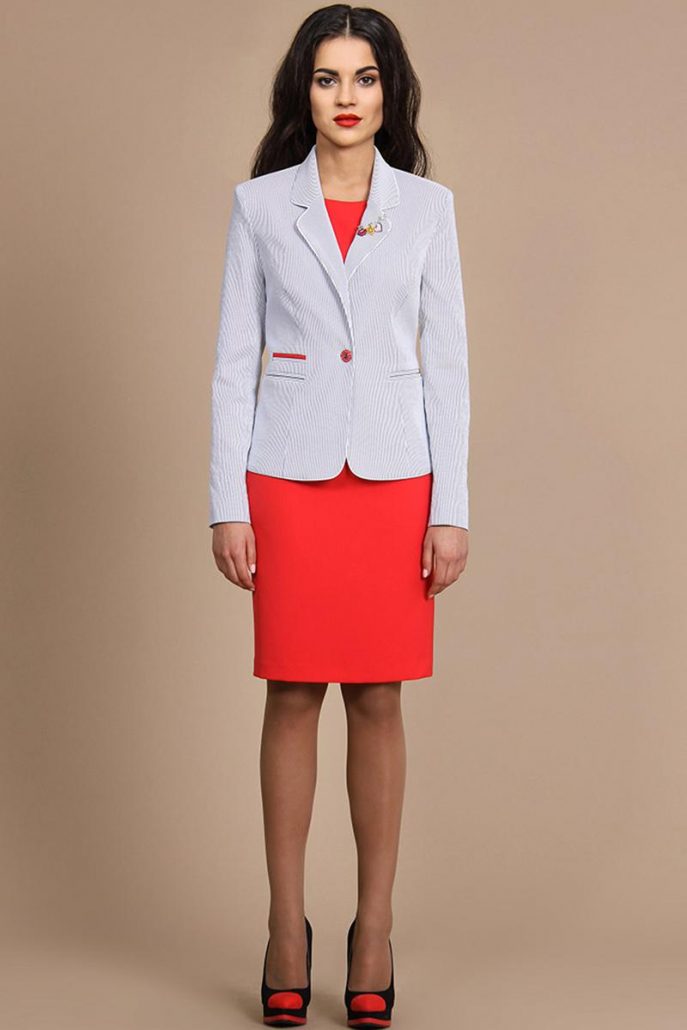 Класичний діловий образ передбачає поєднання сірій спідниці-олівець з приталеною білою блузою. У цьому ансамблі доречними будуть чорний шкіряний ремінець, жакет відтінку маренго і чорні класичні туфлі.
