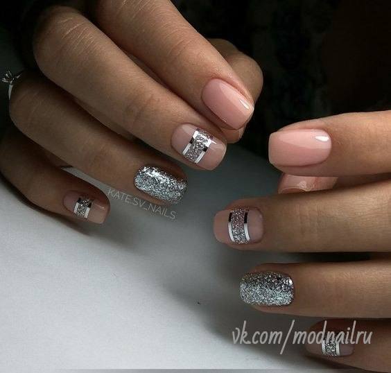 Відмінно виглядає срібний манікюр на різній довжині нігтів, але якщо слідувати модним віянням, то довжина ваших нігтів повинна становити не більше трьох міліметрів. При такій довжині, варто виключити щедрий декор і скористатися простим покриттям дзеркального рівного шару. Вдалим варіантом залишається традиційна класика – френч. Як варіант можна зробити кольорове основне покриття з срібною посмішкою, або ж усе з точністю навпаки. Але більш вражаючим буде манікюр, у поточному році, з використанням двох сріблястих тонів, які будуть відмінні за фактурою, наприклад, за допомогою втирки зробити шорстку поверхню схожу з матеріалом «парча» і промальовувати дзеркальну посмішку за допомогою слюди. Візуально звузить і подовжить короткі нігті непомітний і охайний вертикальний малюнок. Не забувайте про стиль полулунного манікюру, так як відтінена лінія кутикули зробить ваші ручки більш граціозними і витонченими.