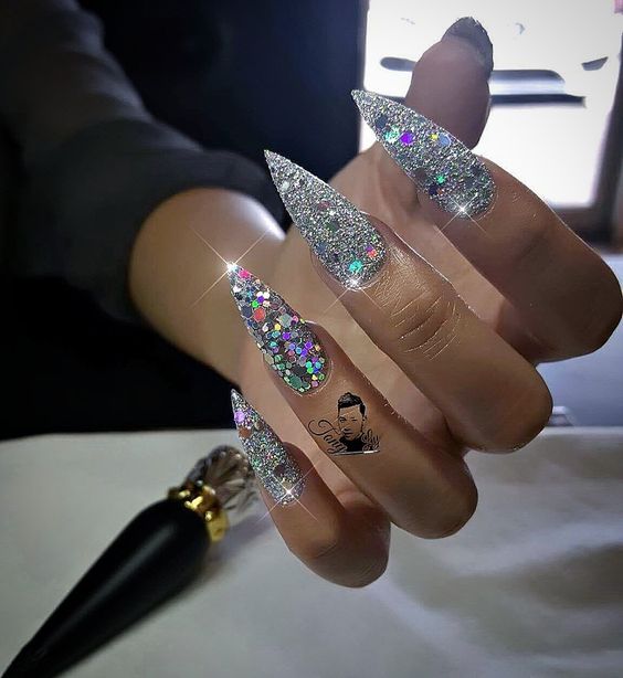 Запаморочливо виглядають довгі нігтики з срібним манікюром, вони мимоволі привертають увагу до сміливої модниці. Досить велика площа пластини дозволяє застосувати практично всі варіації модного манікюру. Це може бути використання втирки з ефектом хамелеона, всілякі малюнки, які не виключають і художнього розпису, застосування фольги і інших декоративних елементів. Для шикарної новомодної вечірки підійде переливається срібний міленіум френч. Перевага такої довжини нігтика в тому, що немає обмежень ні у варіантах з малюнками, ні з орнаментами і, відповідно, з їх розташуванням, в будь-якому випадку манікюр буде виглядати красиво.
